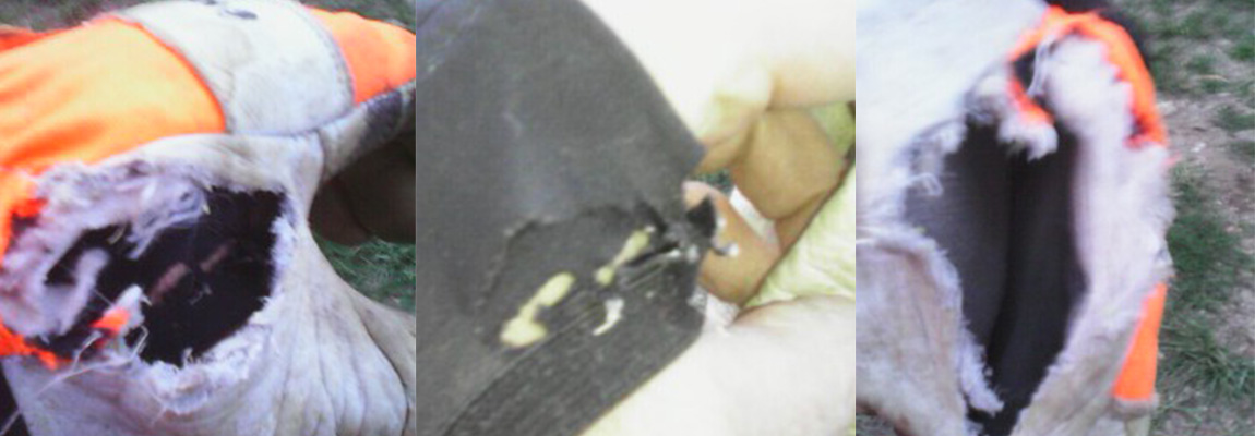 L'ouverture pratiquée par la chaîne dans le gant.... et au deuxième plan dans les mailles du manchon de protection avant bras ; Le même manchon ; pas épaisse la maille....., mais la chaîne s'est accrochée dessus !