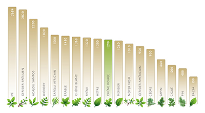 Le chêne rouge ou le chêne blanc, 2 essences très utilisées dans le bûcheronnage se situe au milieu de l'échelle de dureté.