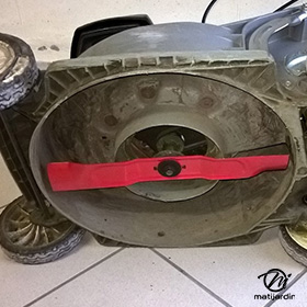Lame tondeuse pour Marina HE4616LS CP047010 coupe 46 cm montée sur une tondeuse Sterking 46EP. Notre client avait vérifié toutes les caractéristiques de sa lame : longueur 46 cm, alésage central 17,9 cm et entraxe 44,8 cm avant de commander sur notre site. Photo pour Matijardin. Merci à notre client Simic M.