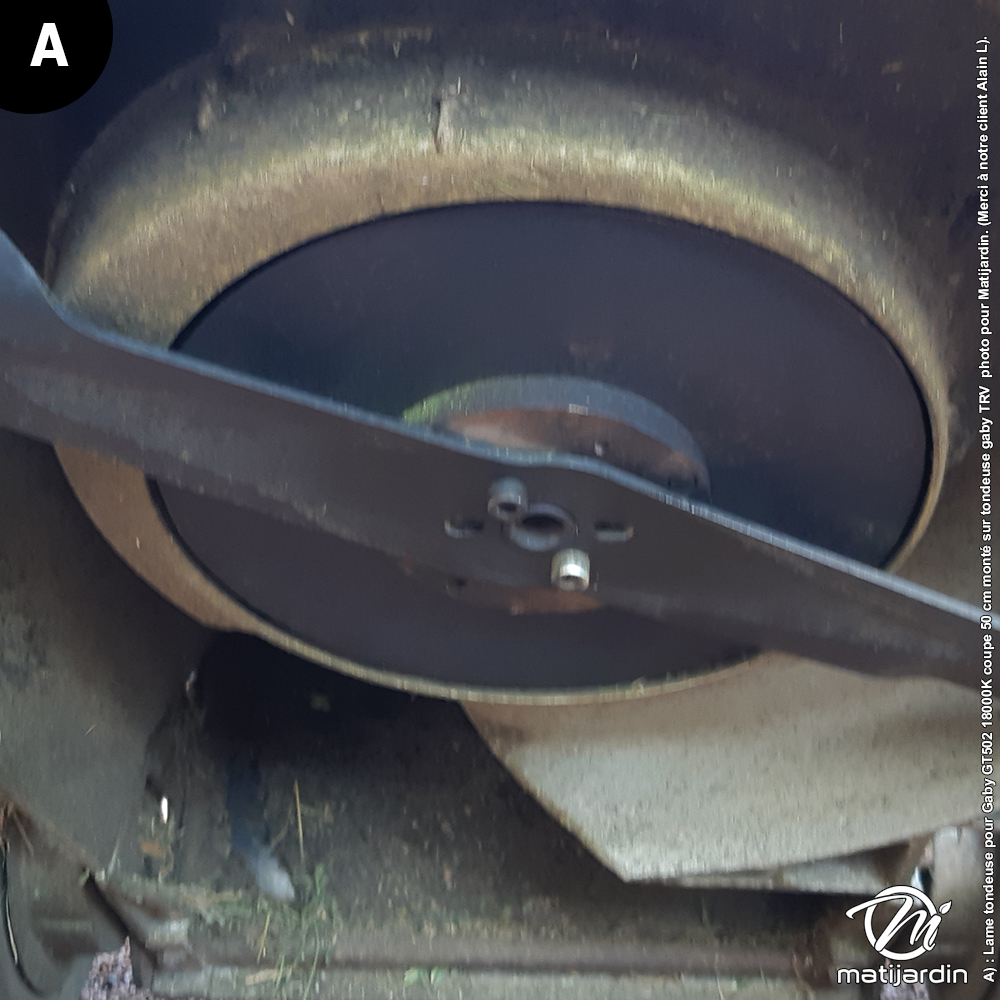 A) : Lame tondeuse pour Gaby GT502 18000K coupe 50 cm monté sur tondeuse gaby TRV photo pour Matijardin. (Merci à notre client Alain L).