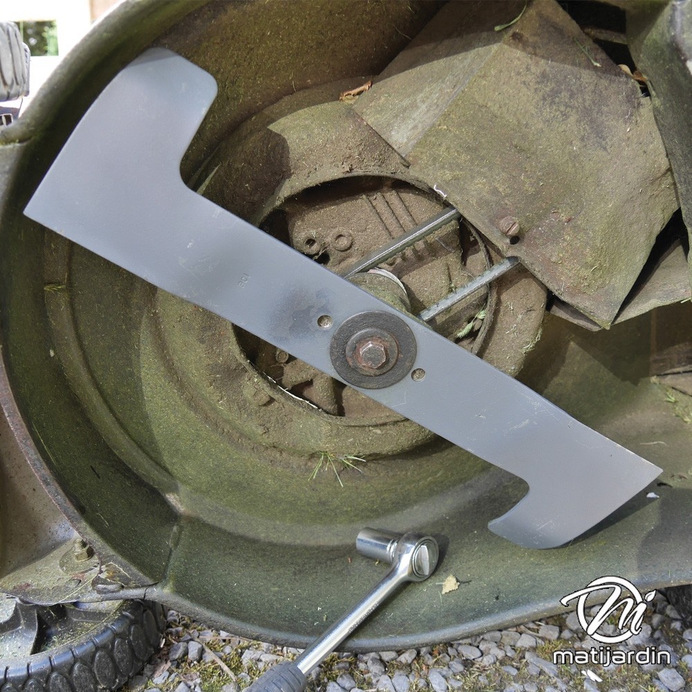 Astuce remontage. Au remontage, attention au sens de montage de la lame ! Pour la plupart des modèles de tondeuse, le côté plat du tranchant de la lame (illustration 2) doit se retrouver côté pelouse. Soyez vigilant, la partie coupante de votre lame peut vite vous envoyer aux urgences ! Matijardin vous conseille d’utiliser des gants.