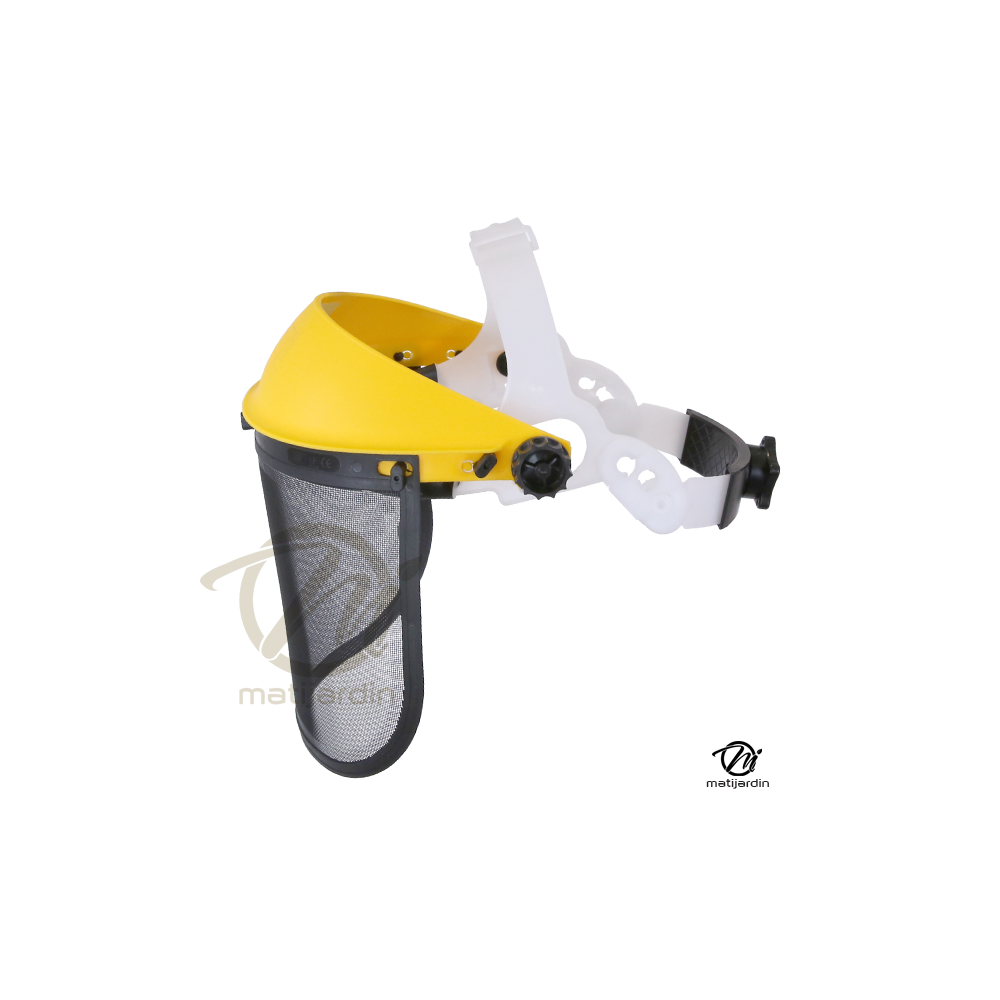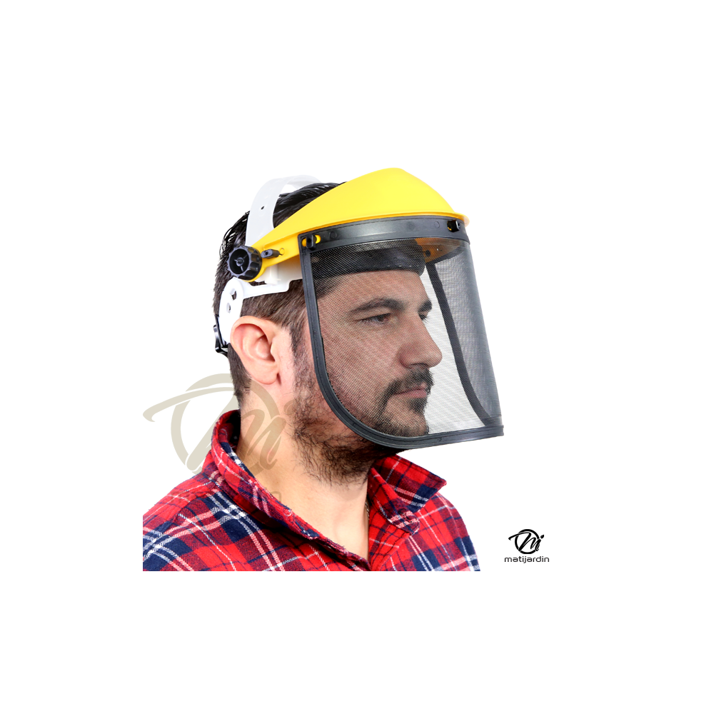 Molettes de réglage avec mousse de maintien pour confort total. Protection faciale. Calotte coloris jaune. Serre-tête réglable par crémaillère. Bande anti-transpiration. Visière grillagée.