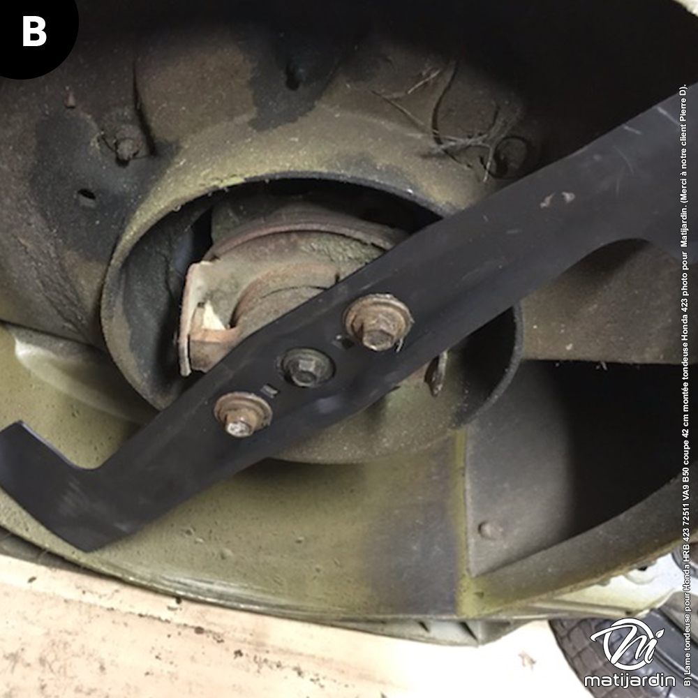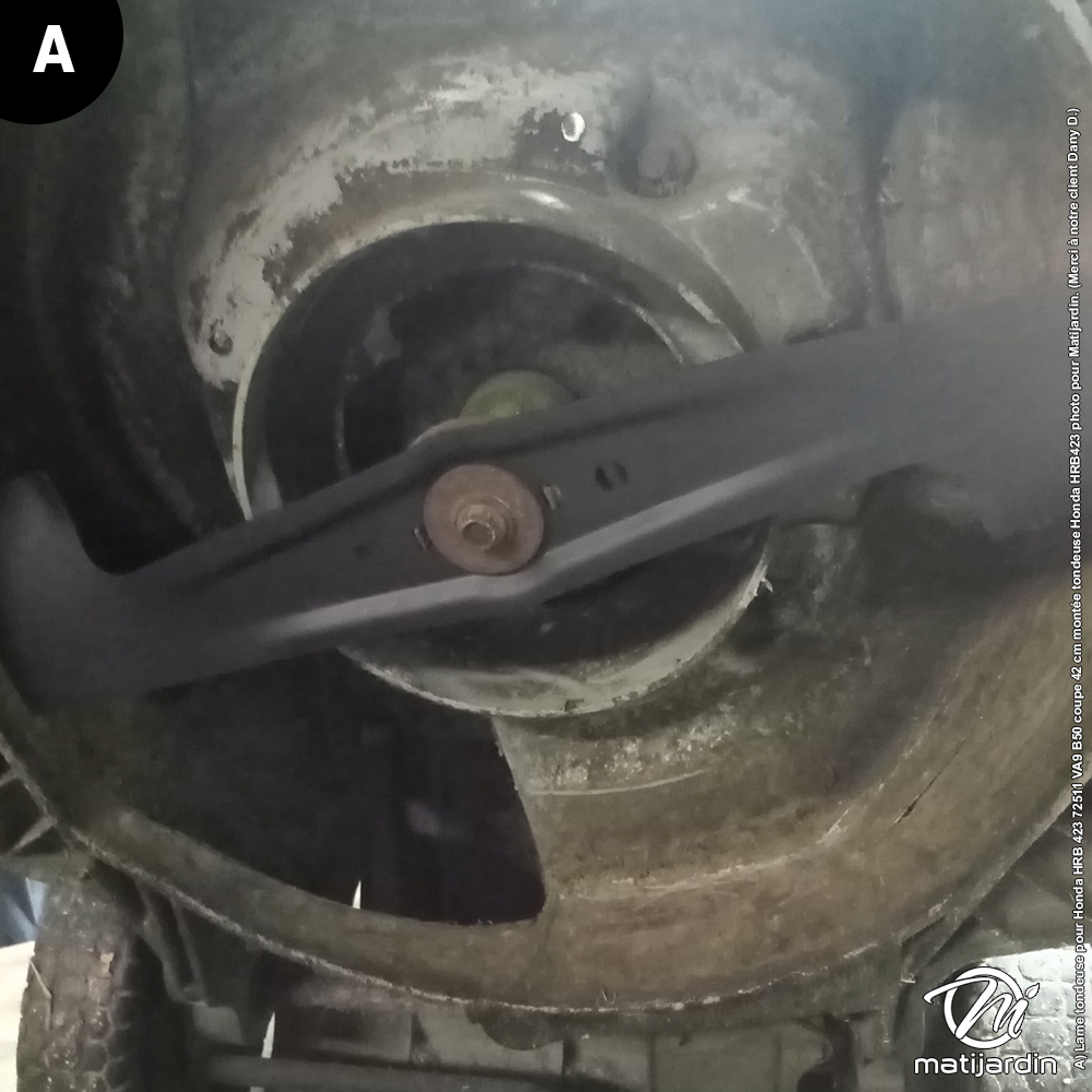 B) Lame tondeuse pour Honda HRB 423 72511 VA9 B50 coupe 42 cm montée tondeuse Honda HRB423 photo pour Matijardin. (Merci à notre client Fabrice L).
