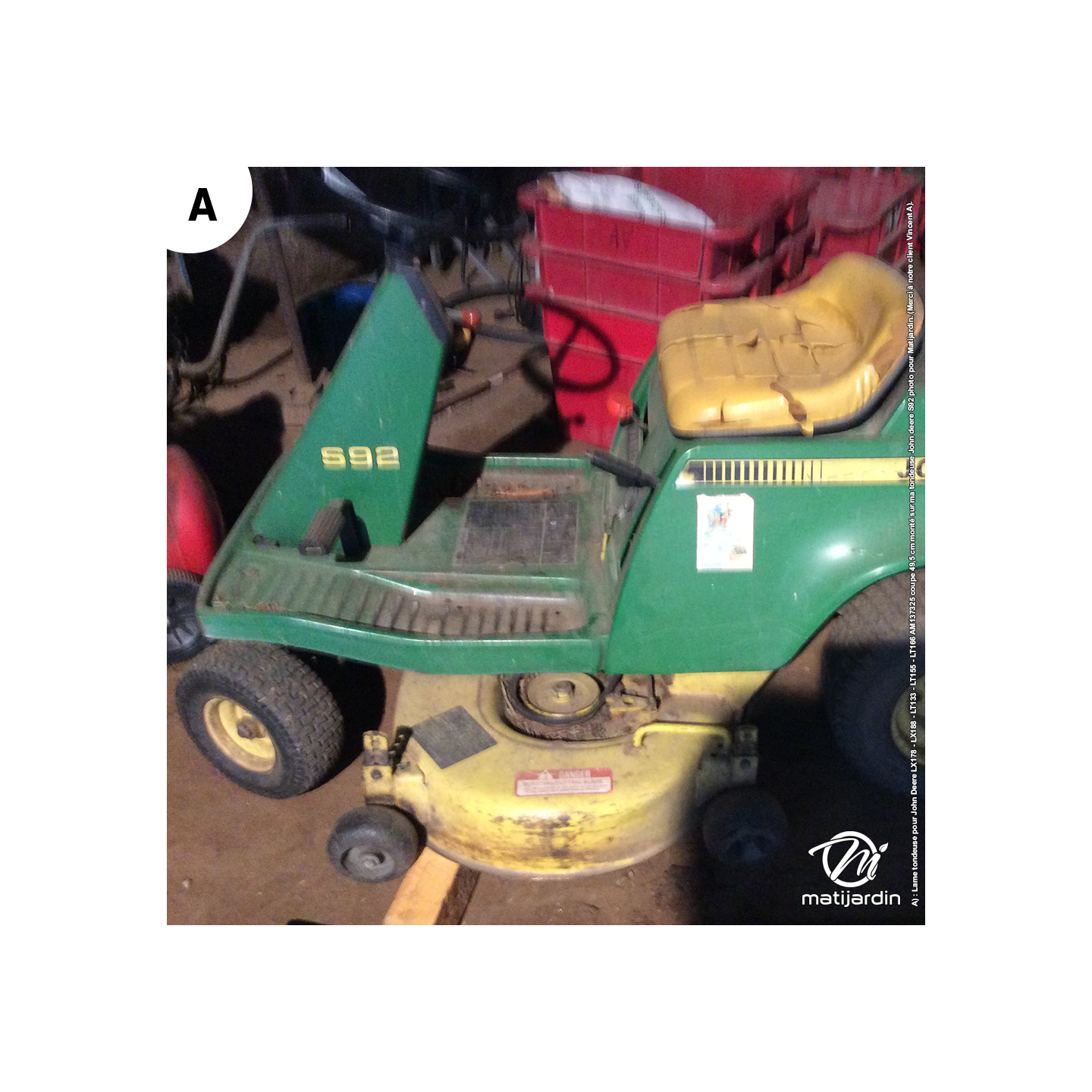 A) : Lame tondeuse pour John Deere LX178 - LX188 - LT133 - LT155 - LT166 AM137325 coupe 49,5 cm monté sur ma tondeuse John deere S92 photo pour Matijardin. (Merci à notre client Vincent A).