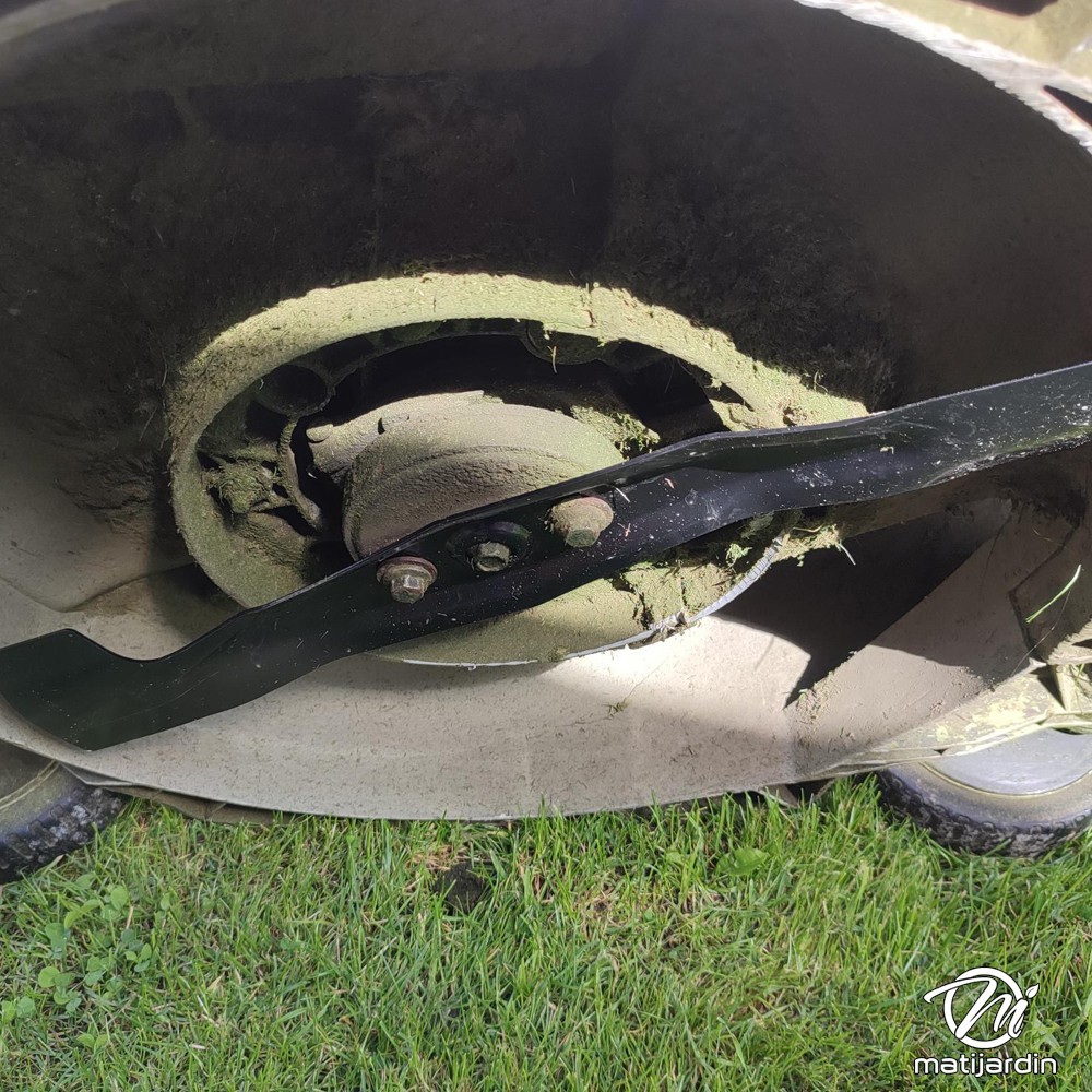 Astuce remontage. Au remontage, attention au sens de montage de la lame ! Pour la plupart des modèles de tondeuse, le côté plat du tranchant de la lame (illustration 2) doit se retrouver côté pelouse. Soyez vigilant, la partie coupante de votre lame peut vite vous envoyer aux urgences ! Matijardin vous conseille d’utiliser des gants.