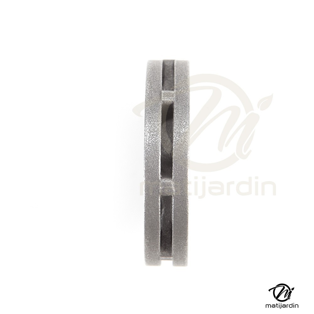 Le pignon d'entraînement de votre chaîne. L'entraînement de la rotation de votre chaîne est dû à la rotation du pignon. Ce pignon est lui-même propulsé par le moteur. L'espacement et le nombre de dents du pignon est en fonction du nombre d'entraîneurs de la chaîne et de son pas. Les entraîneurs guident votre chaîne dans le guide-chaîne et sont entraînés par le pignon. Le pas de la chaîne correspond à la longueur des maillons qui la constituent. A savoir : Notez les références avant de penser à remplacer le pignon, ces infos sont à respecter scrupuleusement.