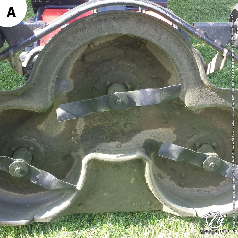 A) Lame tondeuse pour Husqvarna Rider 15V2 544 10 30-01 coupe 38,9 cm montée sur jonsered type fr2116ma photo pour Matijardin. (Merci à notre cliente B.Xavier.)