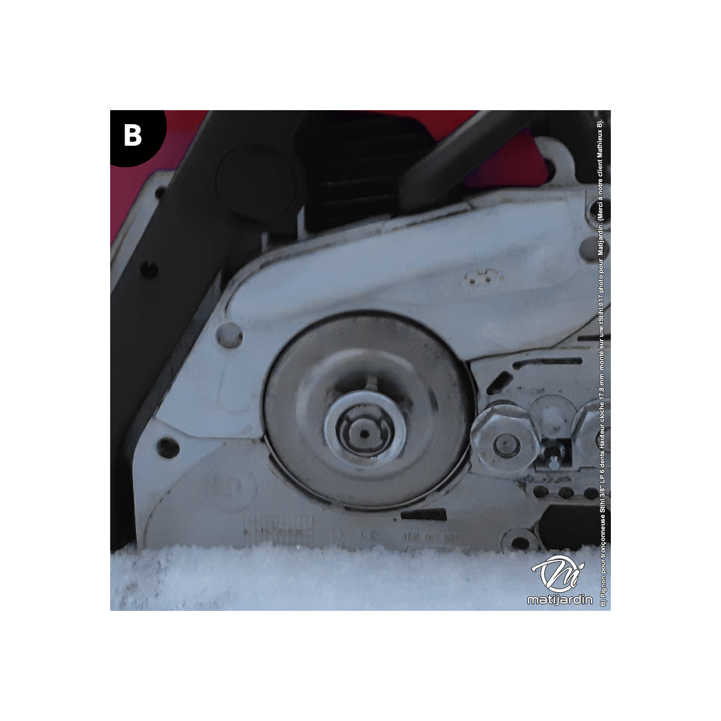 B) Pignon pour tronçonneuse Stihl 3/8" LP 6 dents Hauteur cloche 17,8 mm monté sur une tStihl 017 photo pour Matijardin. (Merci à notre client Mathieux B).