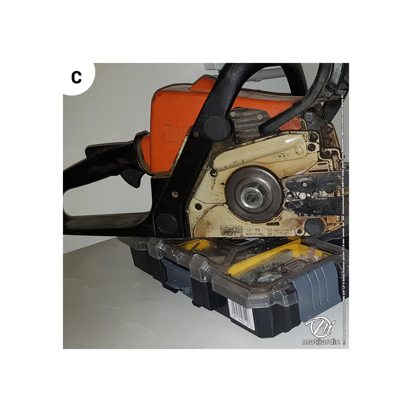 C) Pignon pour tronçonneuse Stihl 3/8" LP 6 dents Hauteur cloche 17,8 mm monté sur ma tronçonneuse Stihl MS170 turbo photo pour Matijardin. (Merci à notre client Bruno S).