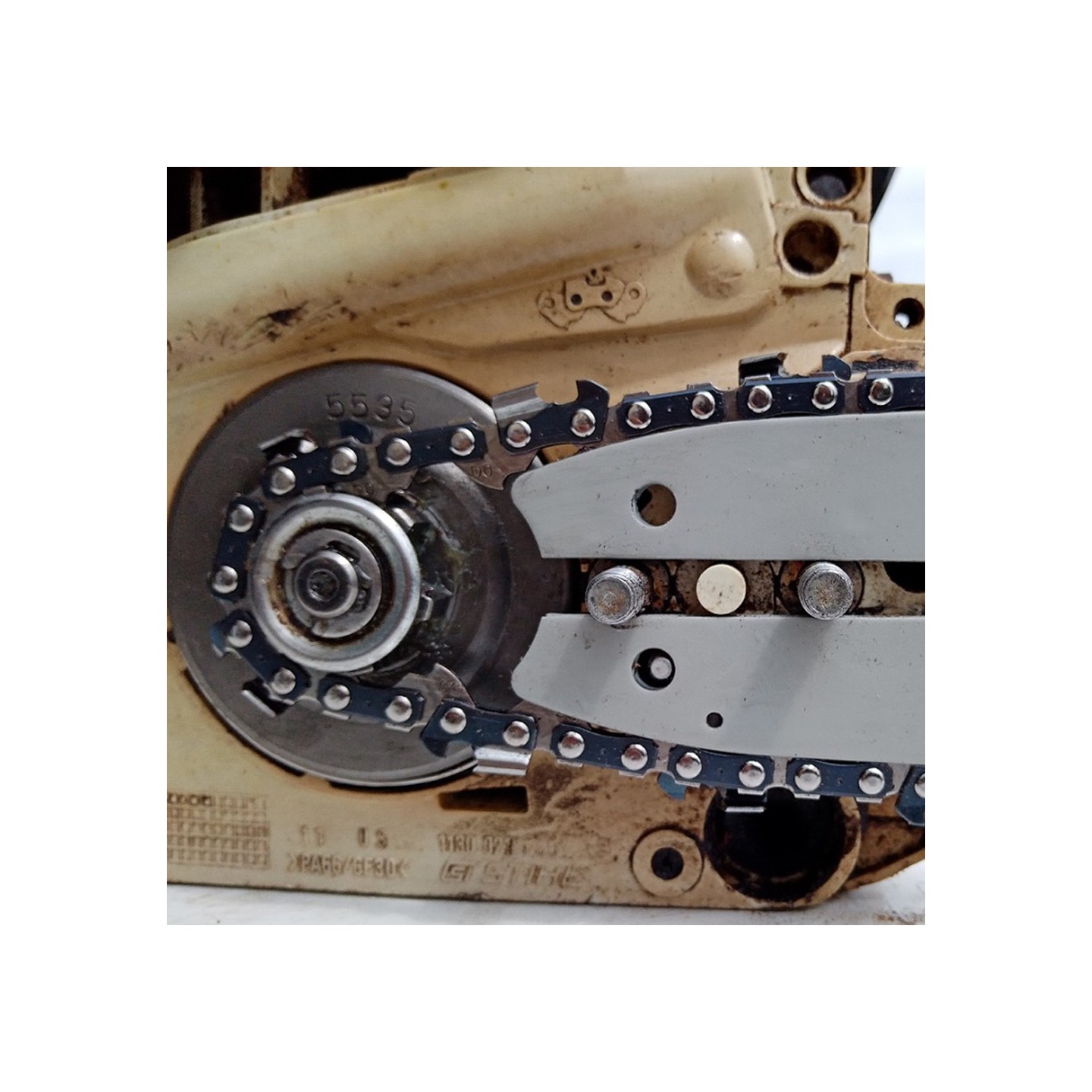 A/ Pignon pour tronçonneuse Stihl 3/8" LP 6 dents Hauteur cloche 17,8 mm montée sur une tronçonneuse Stihl 021 Photo pour Matijardin. (Merci à notre client Yves M.)