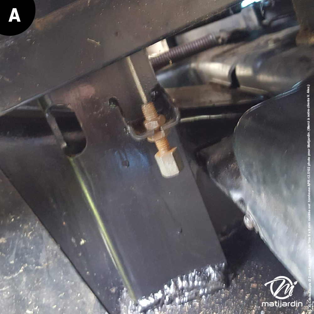 A) Câble souple Ø 2 mm Longueur 2,5 m Tête 6 x 6 mm montée sur  tondeuse APR-12.5102 photo pour Matijardin. (Merci à notre cliente V. Alex.)