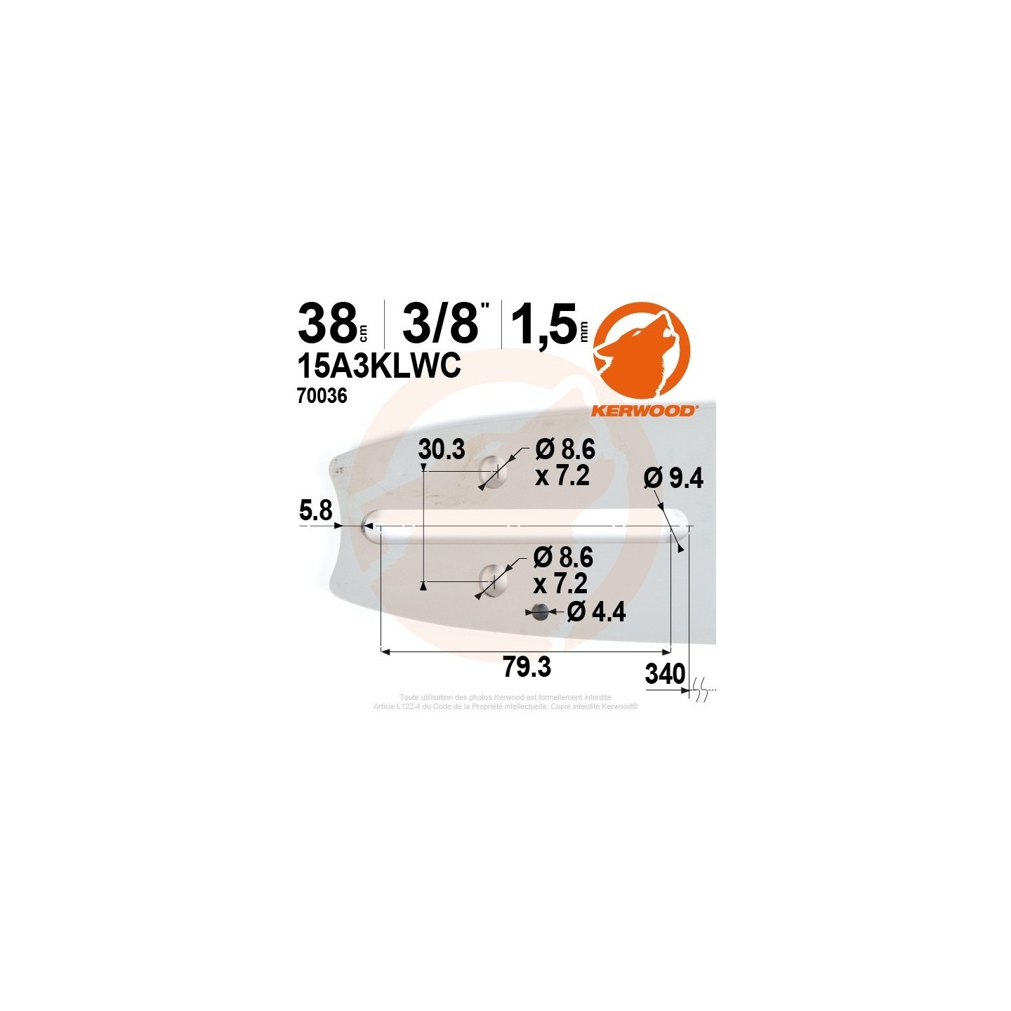 Guide tronçonneuse Kerwood 38 cm 3/8" 1,5 mm. 56 maillons. 15A3KLWC