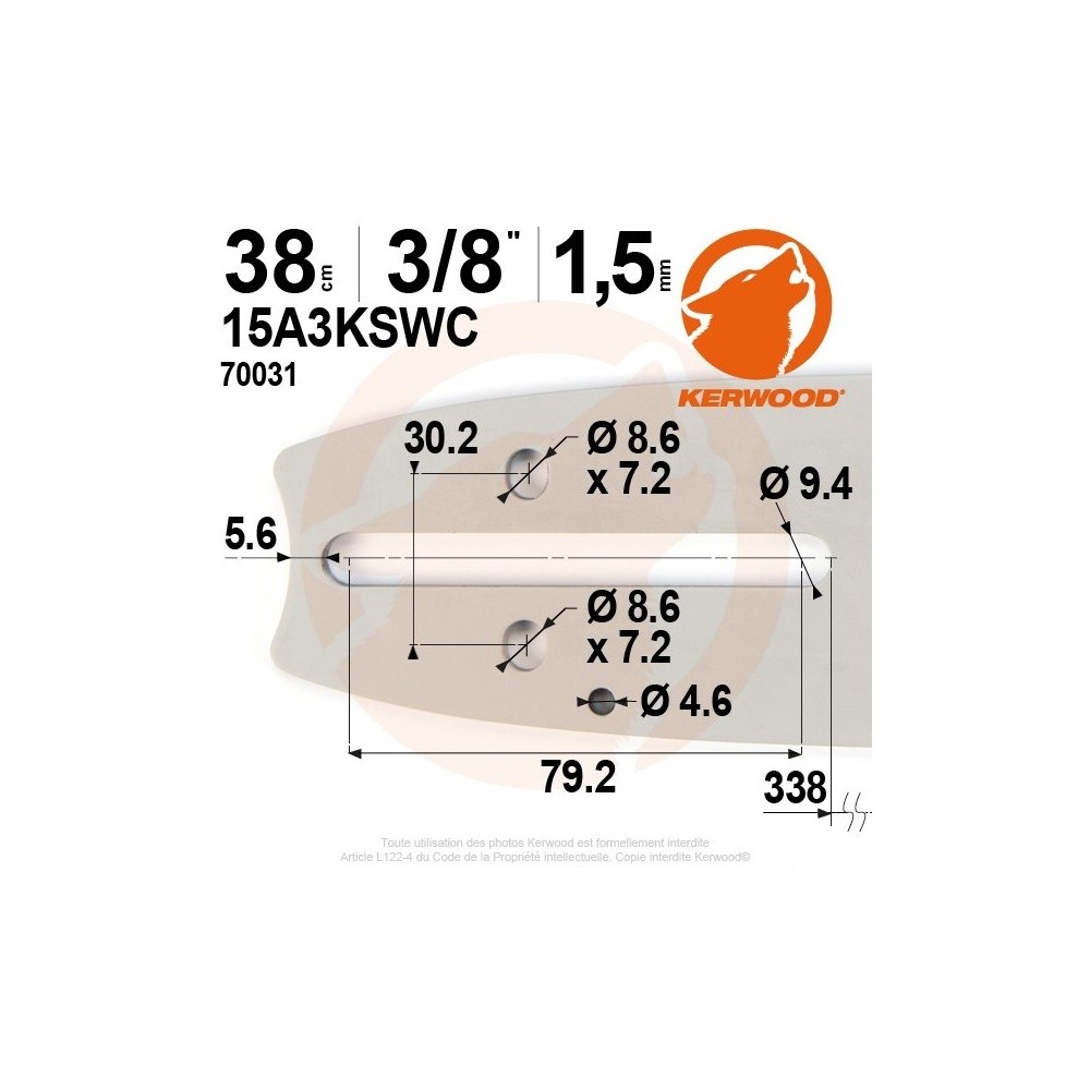 Guide tronçonneuse Kerwood 38 cm 3/8" 1,5 mm. 56 maillons. 15A3KSWC