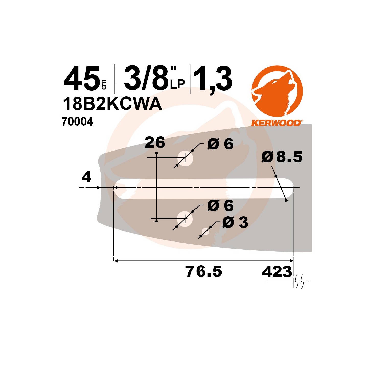 Guide tronçonneuse Kerwood 45 cm. 3/8"LP 1,3 mm. 62 maillons. 18B2KCWA