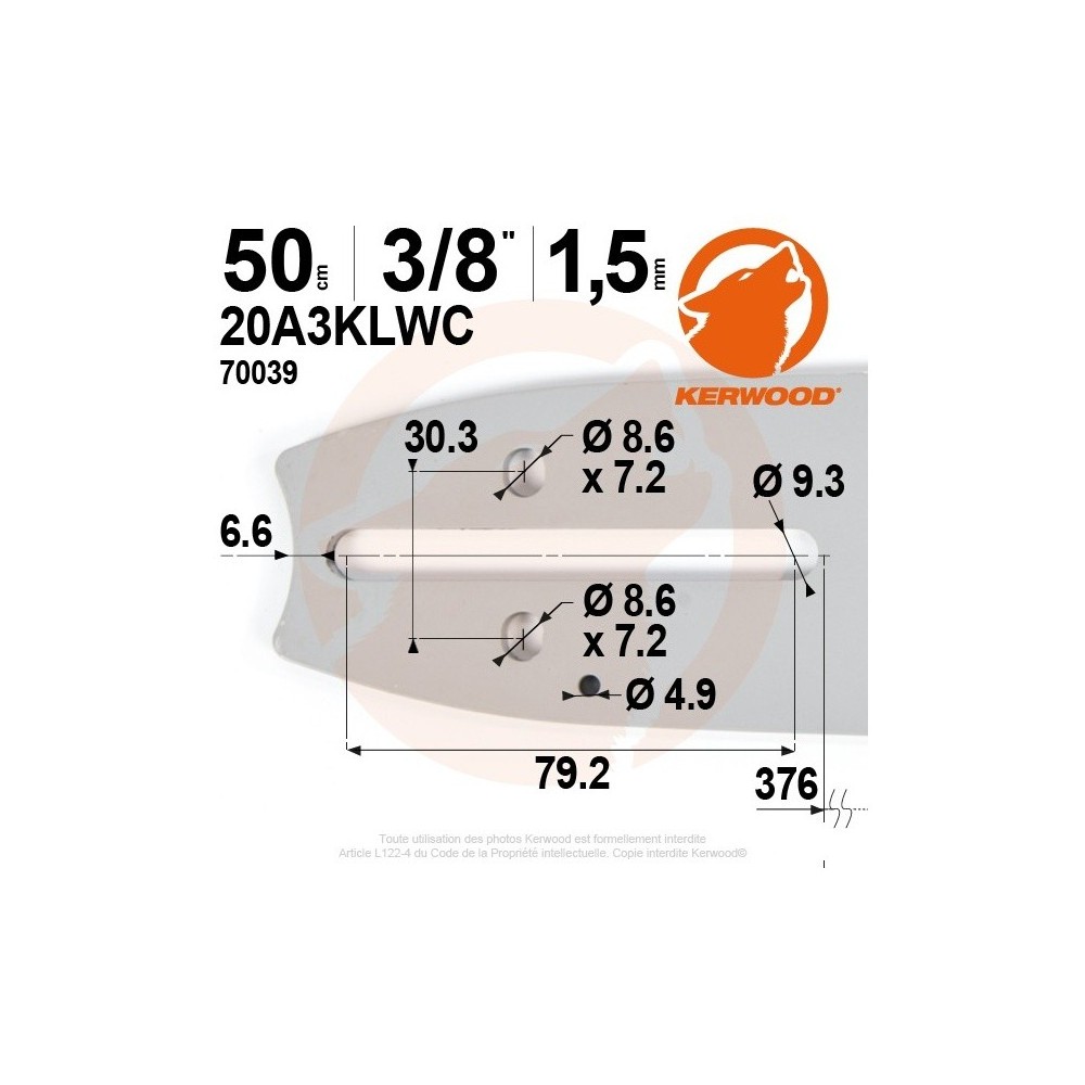 Guide tronçonneuse Kerwood 50 cm 3/8" 1,5 mm 72 maillons 20A3KLWC