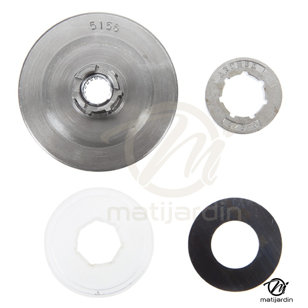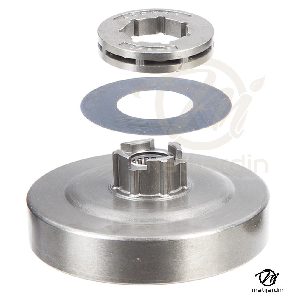 Le pignon d'entraînement de votre chaîne. L'entraînement de la rotation de votre chaîne est dû à la rotation du pignon. Ce pignon est lui-même propulsé par le moteur. L'espacement et le nombre de dents du pignon est en fonction du nombre d'entraîneurs de la chaîne et de son pas. Les entraîneurs guident votre chaîne dans le guide-chaîne et sont entraînés par le pignon. Le pas de la chaîne correspond à la longueur des maillons qui la constituent. A savoir : Notez les références avant de penser à remplacer le pignon, ces infos sont à respecter scrupuleusement.