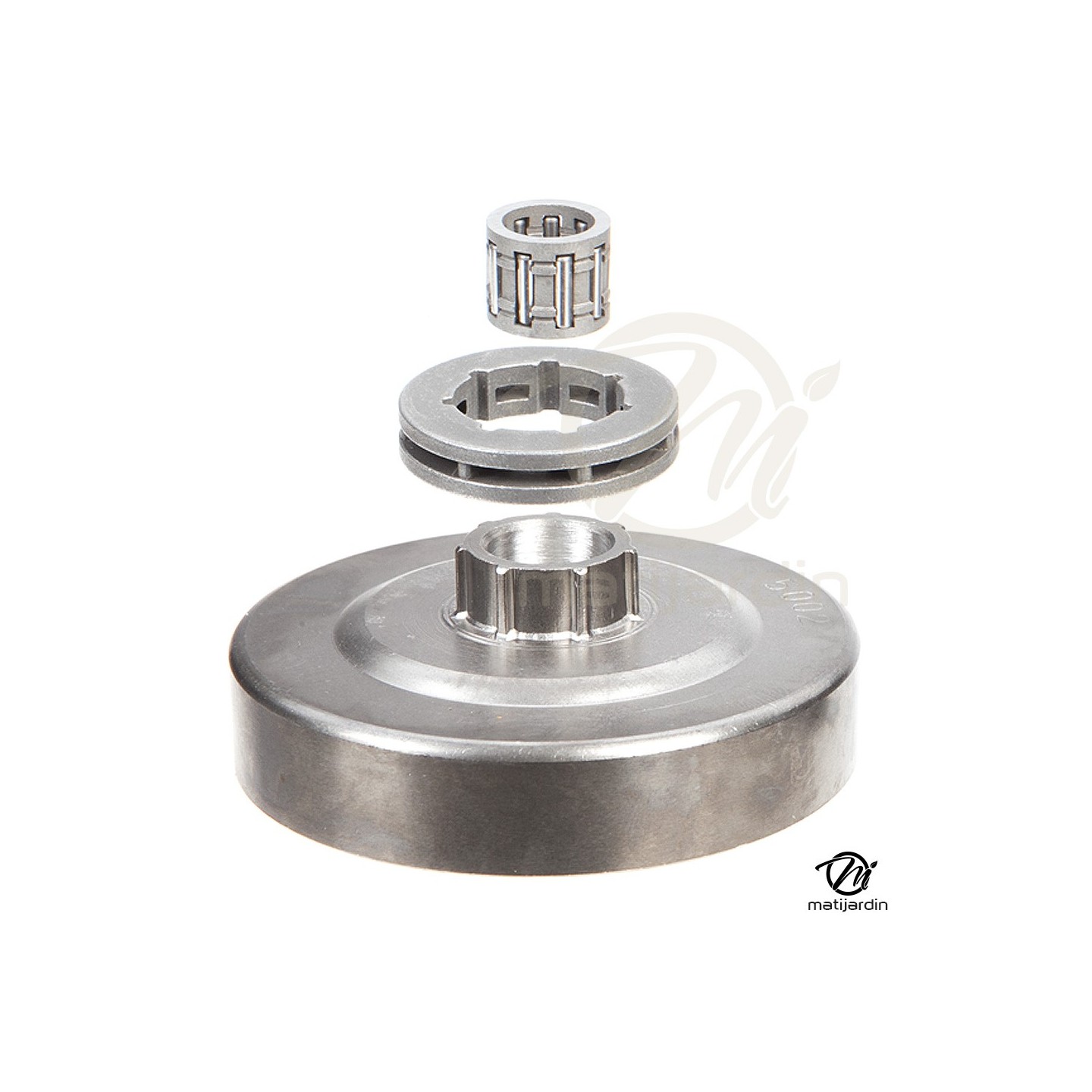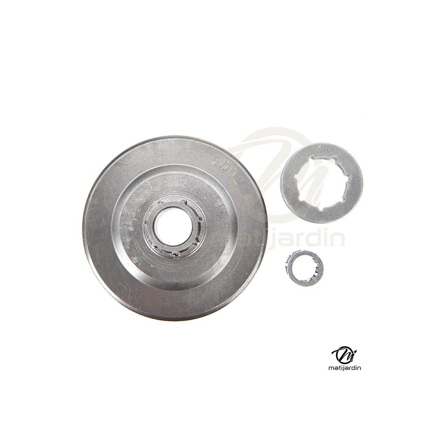 Le pignon d'entraînement de votre chaîne. L'entraînement de la rotation de votre chaîne est dû à la rotation du pignon. Ce pignon est lui-même propulsé par le moteur. L'espacement et le nombre de dents du pignon est en fonction du nombre d'entraîneurs de la chaîne et de son pas. Les entraîneurs guident votre chaîne dans le guide-chaîne et sont entraînés par le pignon. Le pas de la chaîne correspond à la longueur des maillons qui la constituent. A savoir : Notez les références avant de penser à remplacer le pignon, ces infos sont à respecter scrupuleusement.