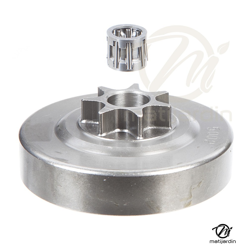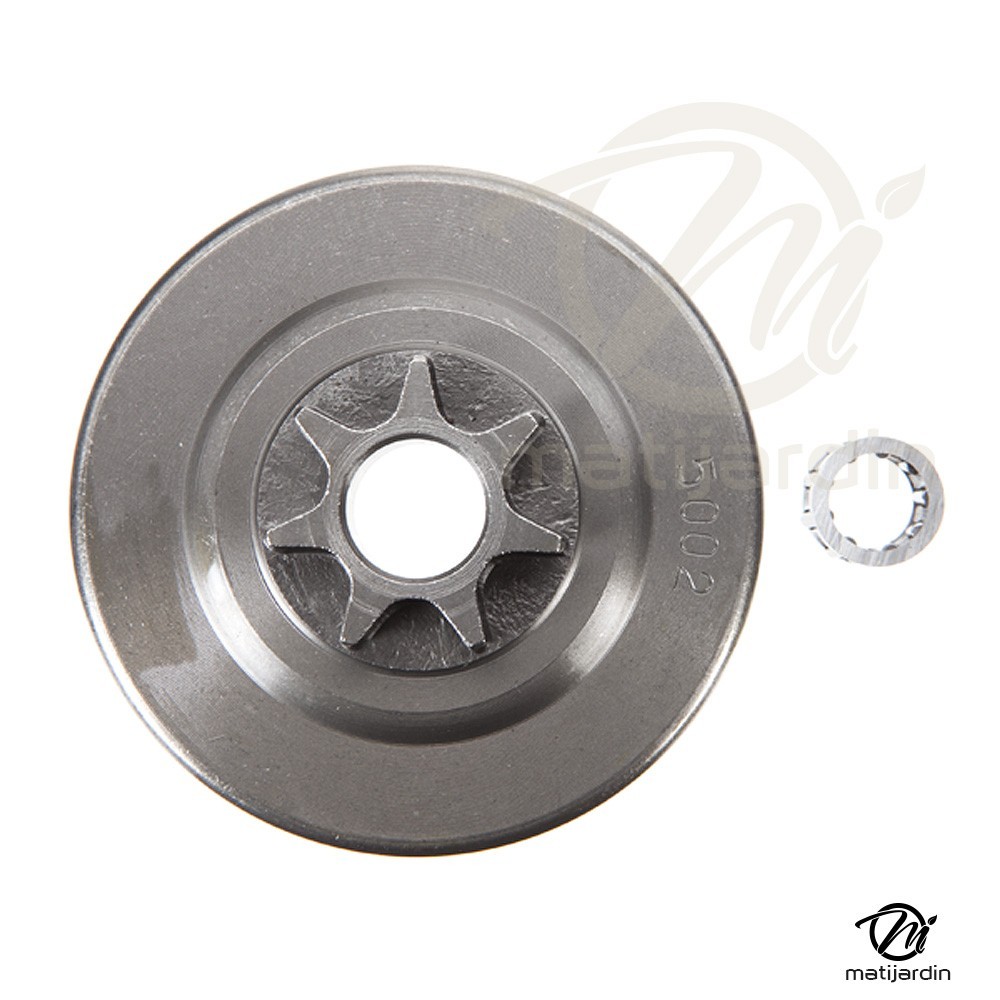 Le pignon d'entraînement de votre chaîne. L'entraînement de la rotation de votre chaîne est dû à la rotation du pignon. Ce pignon est lui-même propulsé par le moteur. L'espacement et le nombre de dents du pignon est en fonction du nombre d'entraîneurs de la chaîne et de son pas. Les entraîneurs guident votre chaîne dans le guide-chaîne et sont entraînés par le pignon. Le pas de la chaîne correspond à la longueur des maillons qui la constituent. A savoir : Notez les références avant de penser à remplacer le pignon, ces infos sont à respecter scrupuleusement.