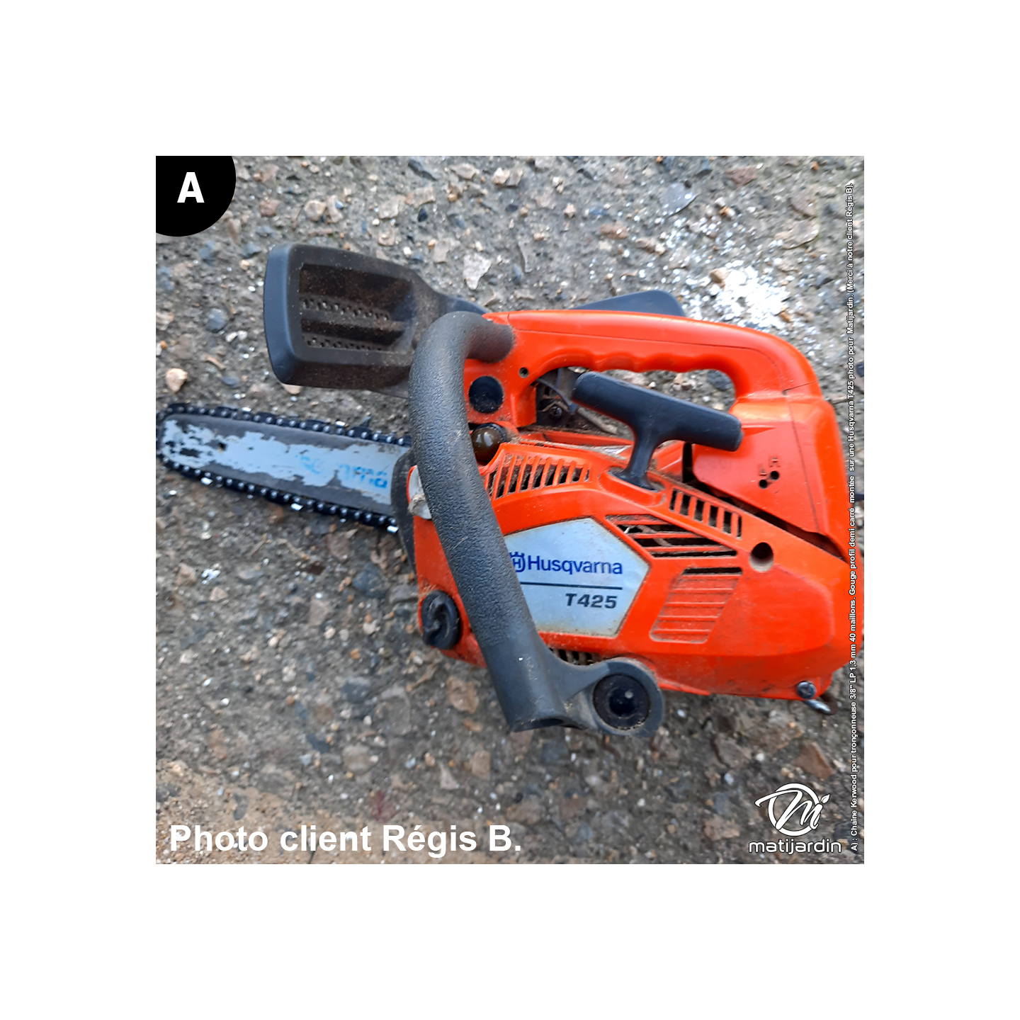 A) : Chaîne Kerwood pour tronçonneuse 3/8" LP 1,3 mm 40 maillons. Gouge profil demi carré montée sur une Husqvarna T425 photo pour Matijardin. (Merci à notre client Régis B).