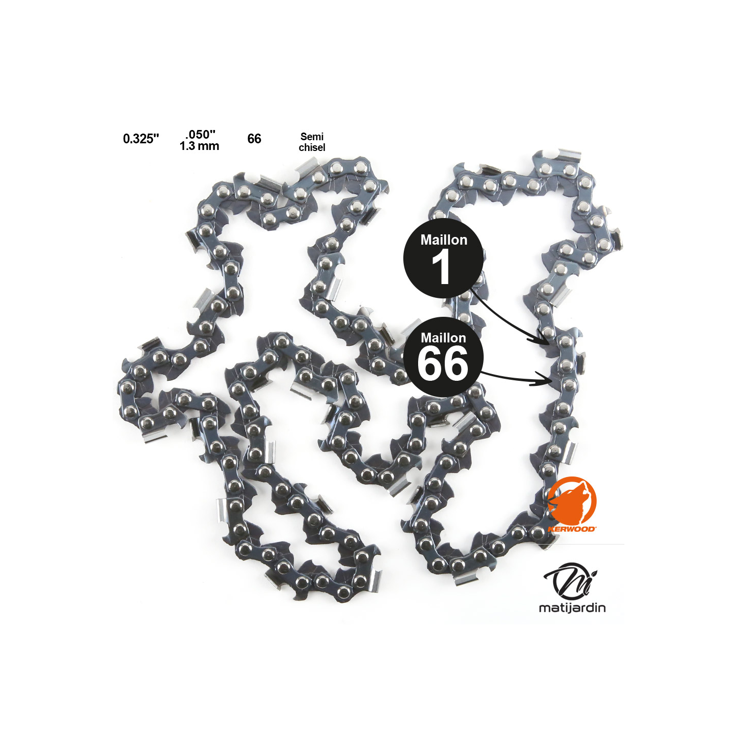 Chaîne 66 entraineurs (maillons) epaisseur de 1,3 mm en pas de .325" de marque Kerwood, pour tronçonneuse thermique et électrique