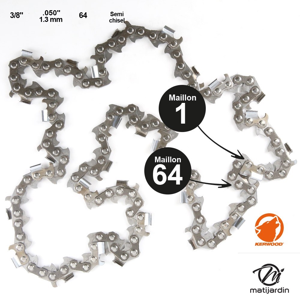 Chaîne 64 entraineurs (maillons) epaisseur de 1,3 mm en pas de 3/8" de marque Kerwood, pour tronçonneuse thermique et électrique