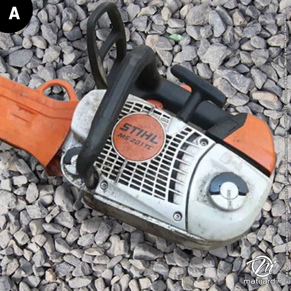 009, 010, 011, 018, 019, 019T, 020, 020, , 021, 023, 025, E10, E14, E160, E180, MSE200, MS200T, MS180, MS191, MS170, MS210, MS230, MSE140, MS160, MS250, MS180, MS192, 201TCA) A) : Kit Kerwood guide + chaîne tronçonneuse 30 cm, 3/8"LP 1,3 mm. 44 maillons monté sur ma Stihl 201TC photo pour Matijardin. (Merci à notre client Gèrard B).