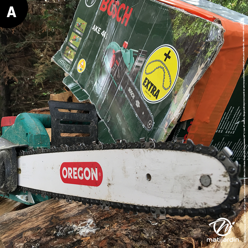 A) Guide tronçonneuse Oregon 40 cm. 3/8"LP 1,1 mm 57 maillons 164MLEA041 Micro Lite + Chaîne Oregon pour tronçonneuse 3/8" 1,1 mm. 57 maillons. Gouge profil demi rond monté sur une tronçonneuse Bosch AKE40 photo pour Matijardin. (Merci à notre client Pascal G)