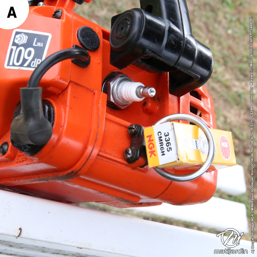 A) Bougie allumage NGK CMR6H pour tondeuse, tronçonneuse montée sur une Echo CS3400 photo pour Matijardin. (Merci à notre client Philippe R).