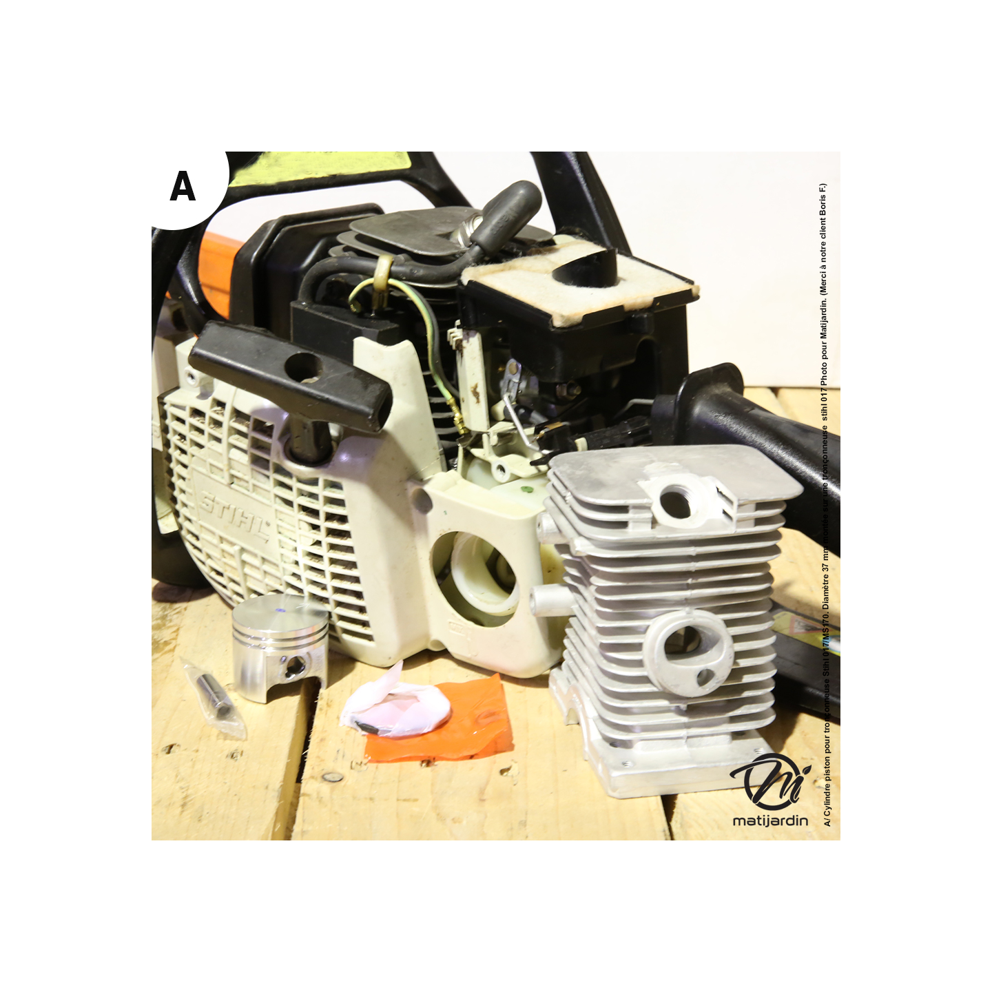 A/ Cylindre piston pour tronçonneuse Stihl 017/MS170. Diamètre 37 mm montée sur une tronçonneuse Stihl 017 année 2004 Photo pour Matijardin. (Merci à notre client Boris F.)