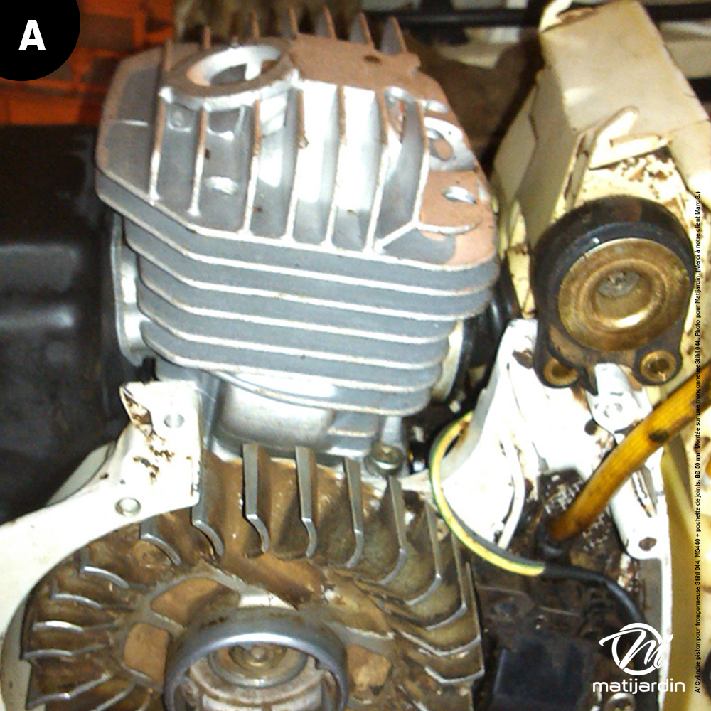 B) : Cylindre piston pour Stihl 044, MS440 + pochette de joints. Ø 50 mm monté sur une MS044 photo pour Matijardin. (Merci à notre client Sylvain p).