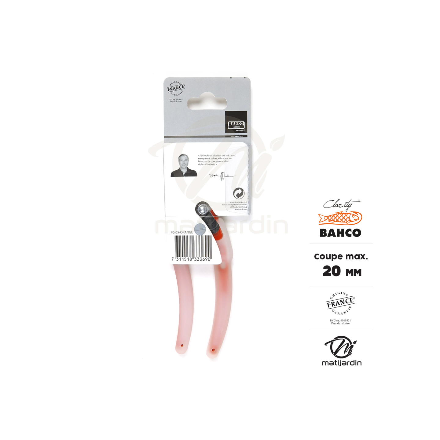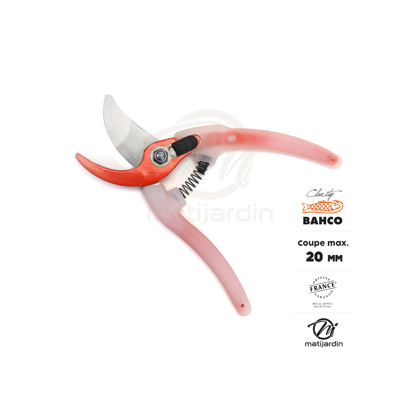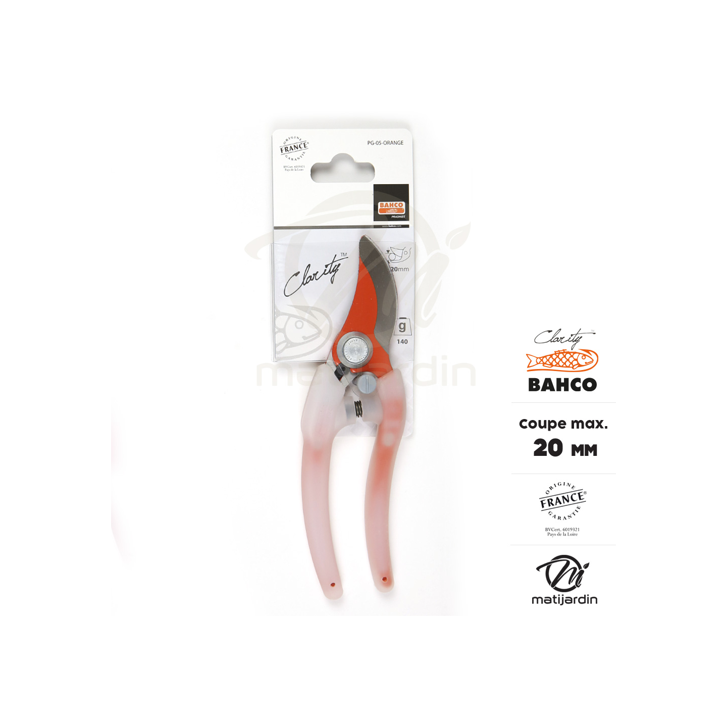 Sécateur Clarity Bahco Pradines PG-05-Orange acier trempé. 20 mm. Confort. Made in France