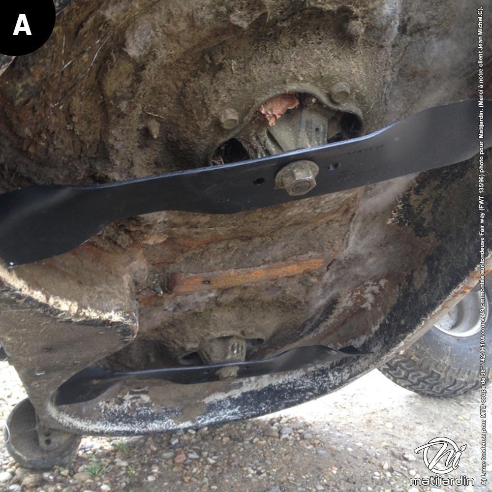A) Lame tondeuse pour MTD coupe de 38" 742-0610A coupe 49 cm montée sur tondeuse fair way (FWT 135-36) photo pour Matijardin. (Merci à notre client jean-michelle C).