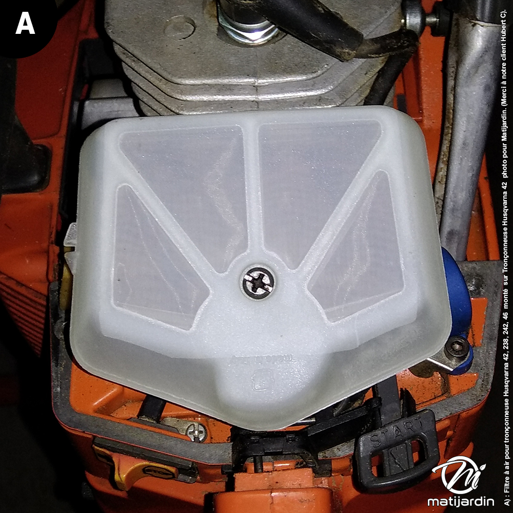 A) : Filtre à air pour tronçonneuse Husqvarna 42, 238, 242, 46 monté sur Tronçonneuse Husqvarna 42 photo pour Matijardin. (Merci à notre client Hubert C).