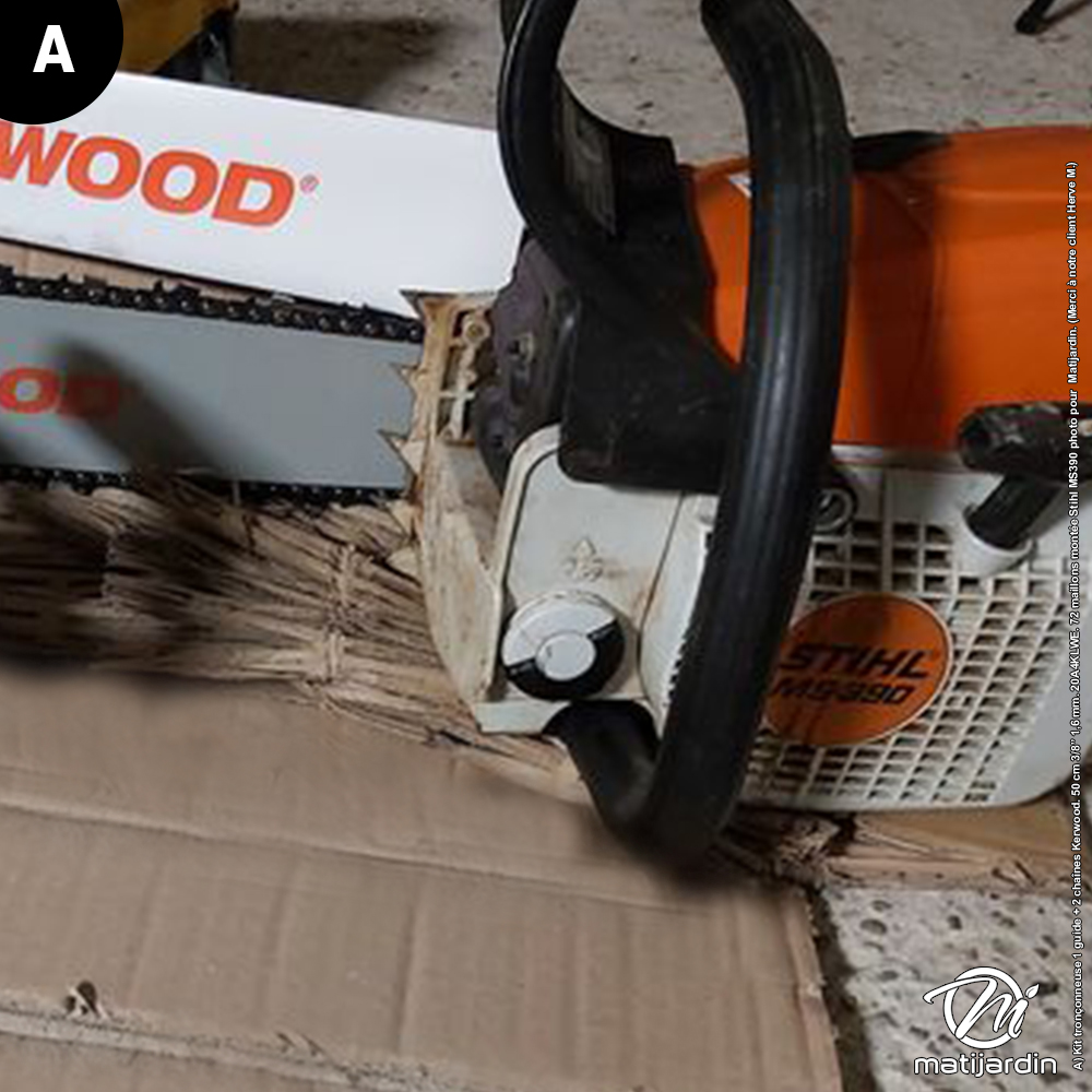 Kit tronçonneuse 1 guide + 2 chaînes Kerwood. 50 cm 3/8” 1,6 mm. 20A4KLWE. 72 maillons montée sur une tronçonneuse MS390 photo pour matijardin (merci à notre client Hervé M).