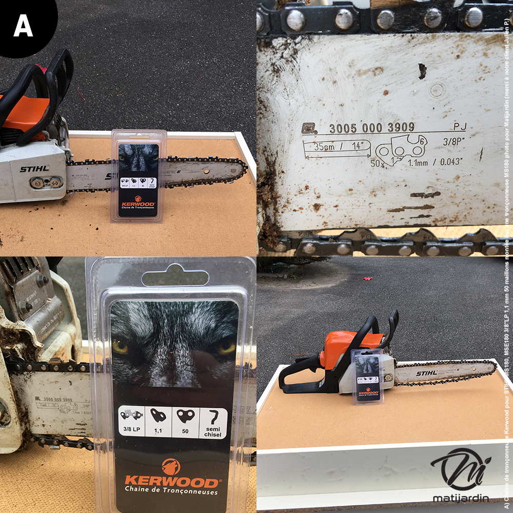 A) Chaîne de tronçonneuse Kerwood pour STIHL MS180, MSE180 3/8"LP 1,1 mm 50 maillons montée sur une tronçonneuse MS180 photo pour Matijardin (merci à notre client Julien P.)