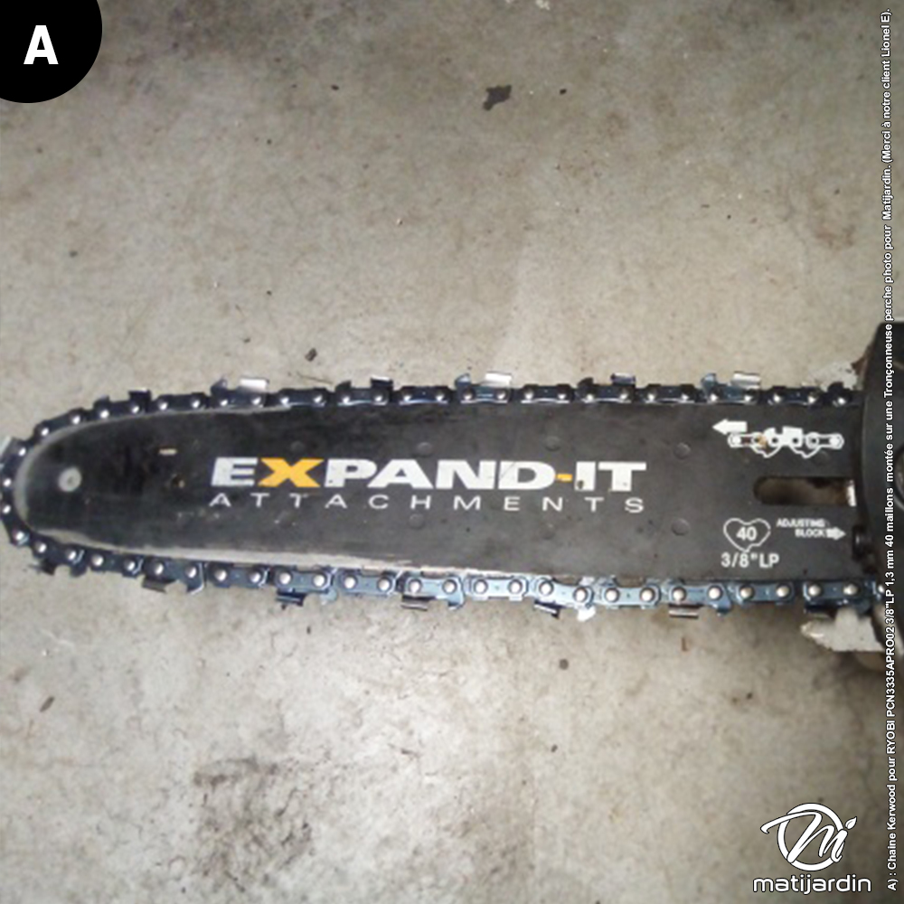 A) : Chaine Kerwood pour RYOBI PCN3335APRO02 3/8"LP 1,3 mm 40 maillons montée sur une Tronçonneuse perche photo pour Matijardin. (Merci à notre client Lionel E).