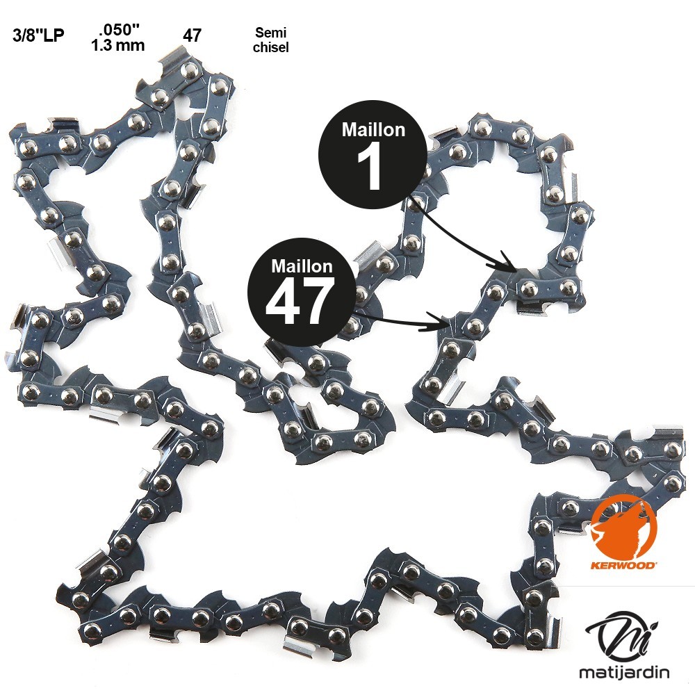 Il existe plusieurs types de chaînes pour la référence de votre tronçonneuse. Ceci est en fonction de la longueur de votre guide. Avant l'achat sur notre espace Matijardin, vérifiez bien le nombre de maillons de votre ancienne chaîne. Comptez bien le nombre de maillons de votre nouvelle chaîne.
