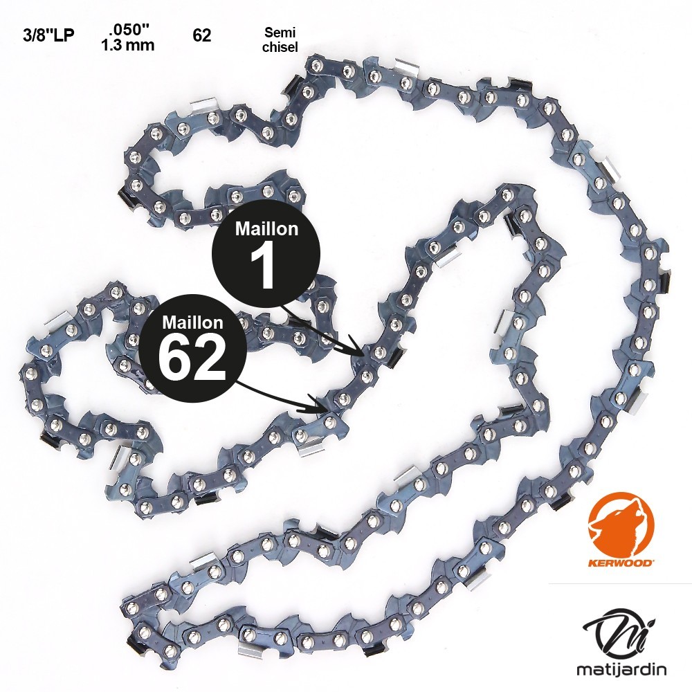 Il existe plusieurs types de chaînes pour la référence de votre tronçonneuse. Ceci est en fonction de la longueur de votre guide. Avant l'achat sur notre espace Matijardin, vérifiez bien le nombre de maillons de votre ancienne chaîne. Comptez bien le nombre de maillons de votre nouvelle chaîne.