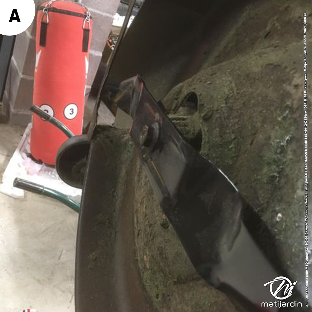 A) : Lame tondeuse pour MTD coupe 42" 942-0616 coupe 53,5 cm montée sur Lame pour MTD YARDMAN Modèle 13BX604G401Série 1D171H10298 photo pour Matijardin. (Merci à notre client julien L).
