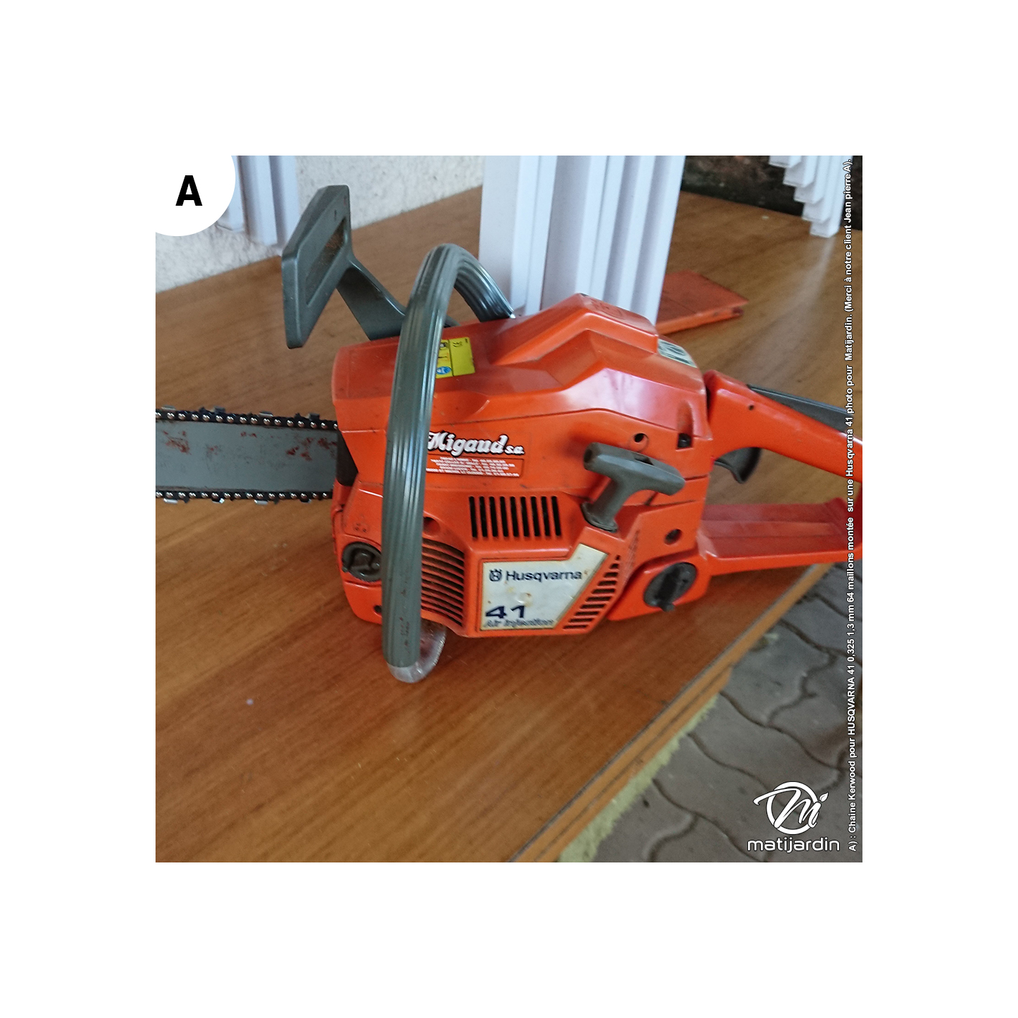 A) : Chaine Kerwood pour HUSQVARNA 41 0,325 1,3 mm 64 maillons montée sur tronçonneuse husqvarna 41 photo pour Matijardin. (Merci à notre client jean pierre A).