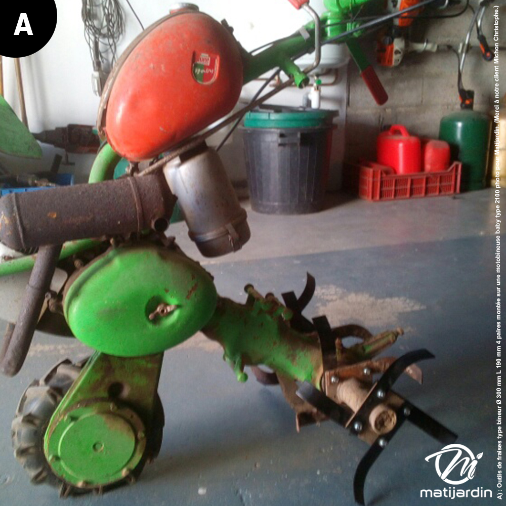 A) : Outils de fraises type bineur Ø 300 mm L 190 mm 4 paires montée sur une motobineuse baby type 2100 photo pour Matijardin. (Merci à notre client Michon Christophe.)