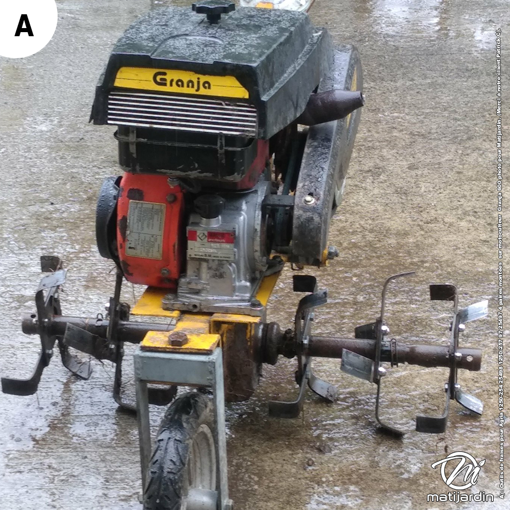 A) : Outils de fraises pour Agria 1250-254 25498 1250-257 97 25497 4 paires montées sur un motoculteur Granja 600 photo pour matijardin. merci à notre client Patrick c).