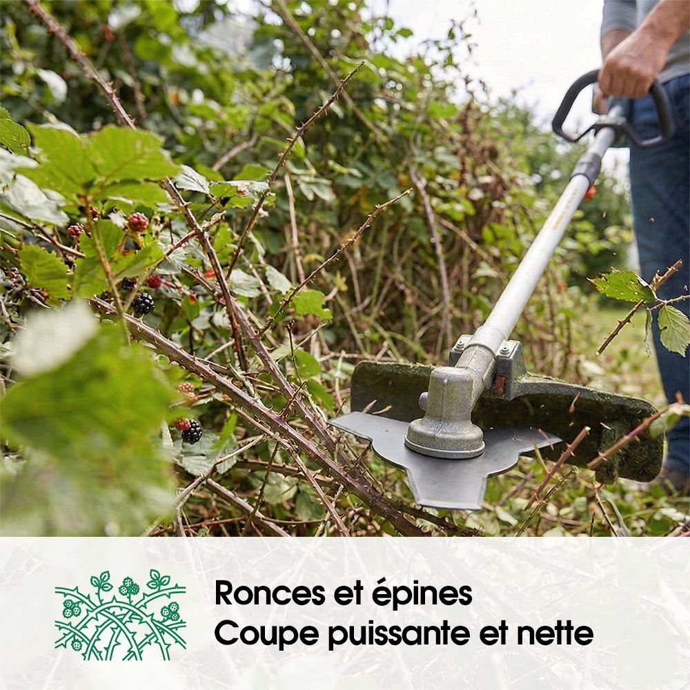 - Offre une excellente pénétration dans les broussailles et ronces tenaces, assurant un travail net et rapide.