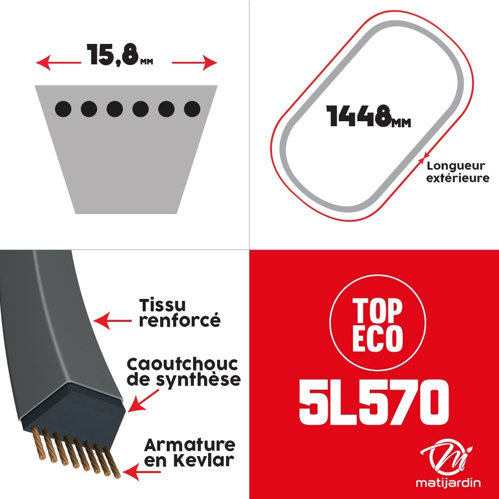 Courroie tondeuse 5L570 prix éco, Kevlar Trapézoïdale - 15,8 mm x 1448 mm