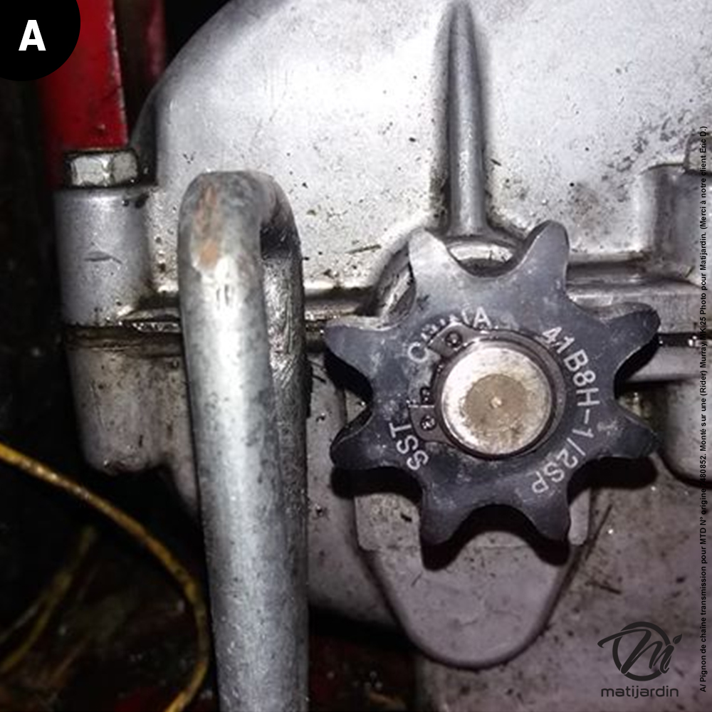 A/ Pignon de chaîne transmission pour MTD N° origine 7480852. Monté sur une (Rider) Murray MK 25 Photo pour Matijardin. (Merci à notre client Eric D.)