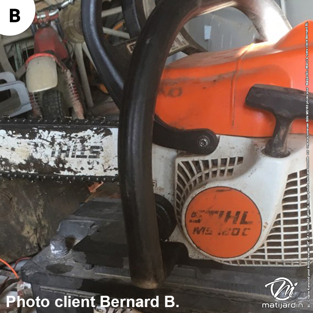 B) : Chaîne Kerwood pour tronçonneuse 3/8" LP 1,3 mm. 50 maillons. Gouge profil demi carré montée sur une troçonneuse Stihl MS180 photo pour Matijardin. (Merci à notre client Bernard B).