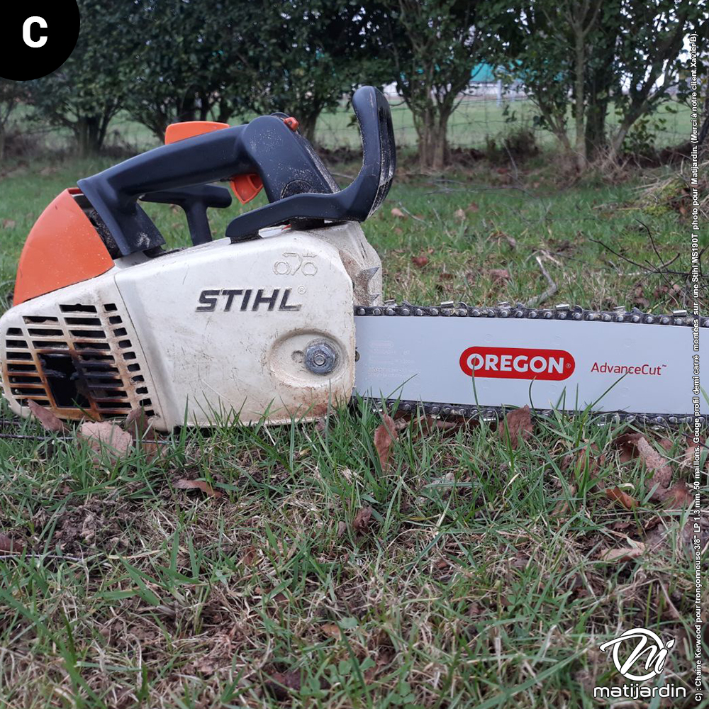 C) : Chaîne Kerwood pour tronçonneuse 3/8" LP 1,3 mm. 50 maillons. Gouge profil demi carré montées sur une Stihl MS190T photo pour Matijardin. (Merci à notre client Xavier B).