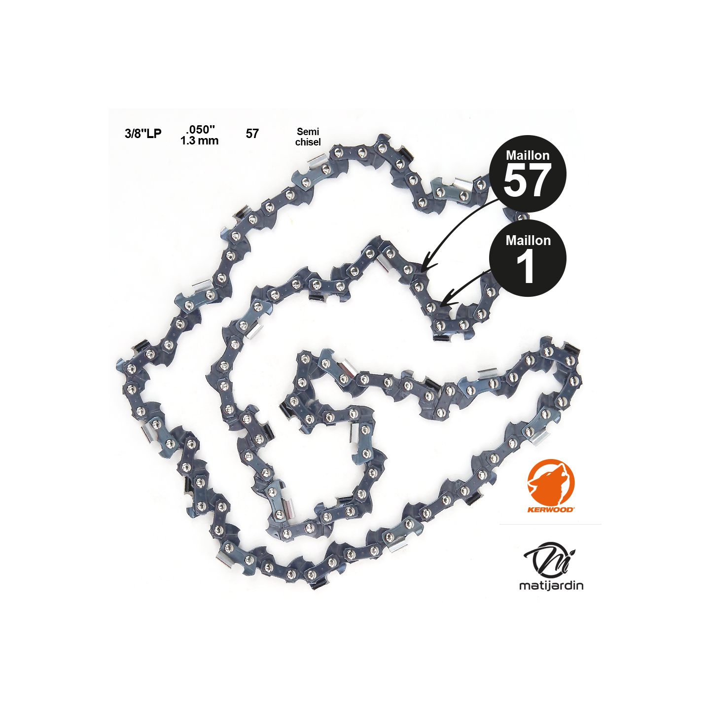Chaîne 57 entraineurs (maillons) epaisseur de 1,3mm en pas de 3/8"LP de marque Kerwood, pour tronçonneuse thermique et électrique