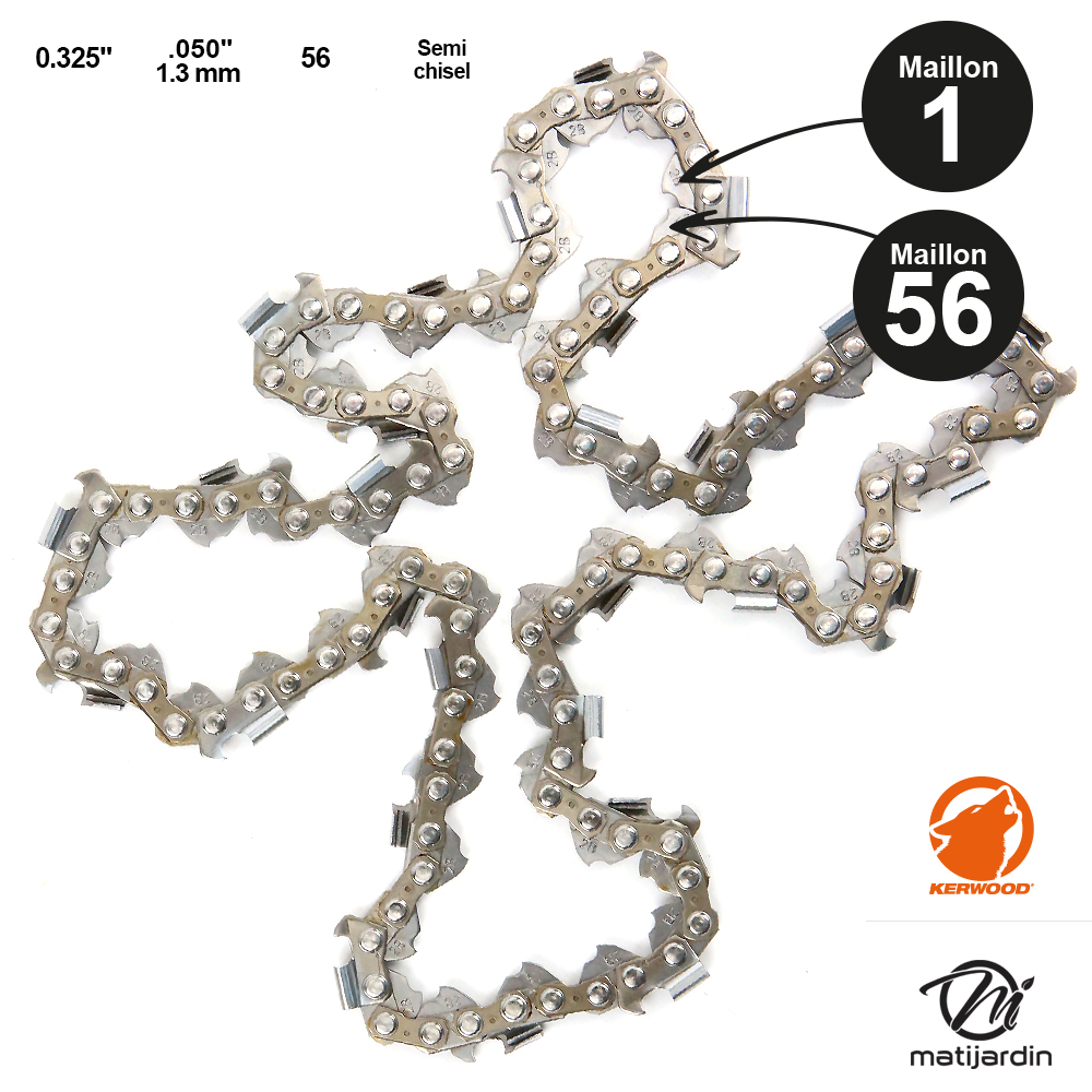 Chaîne Kerwood pour tronçonneuse .325" 1,3 mm. 56 maillons. Gouge profil demi carré