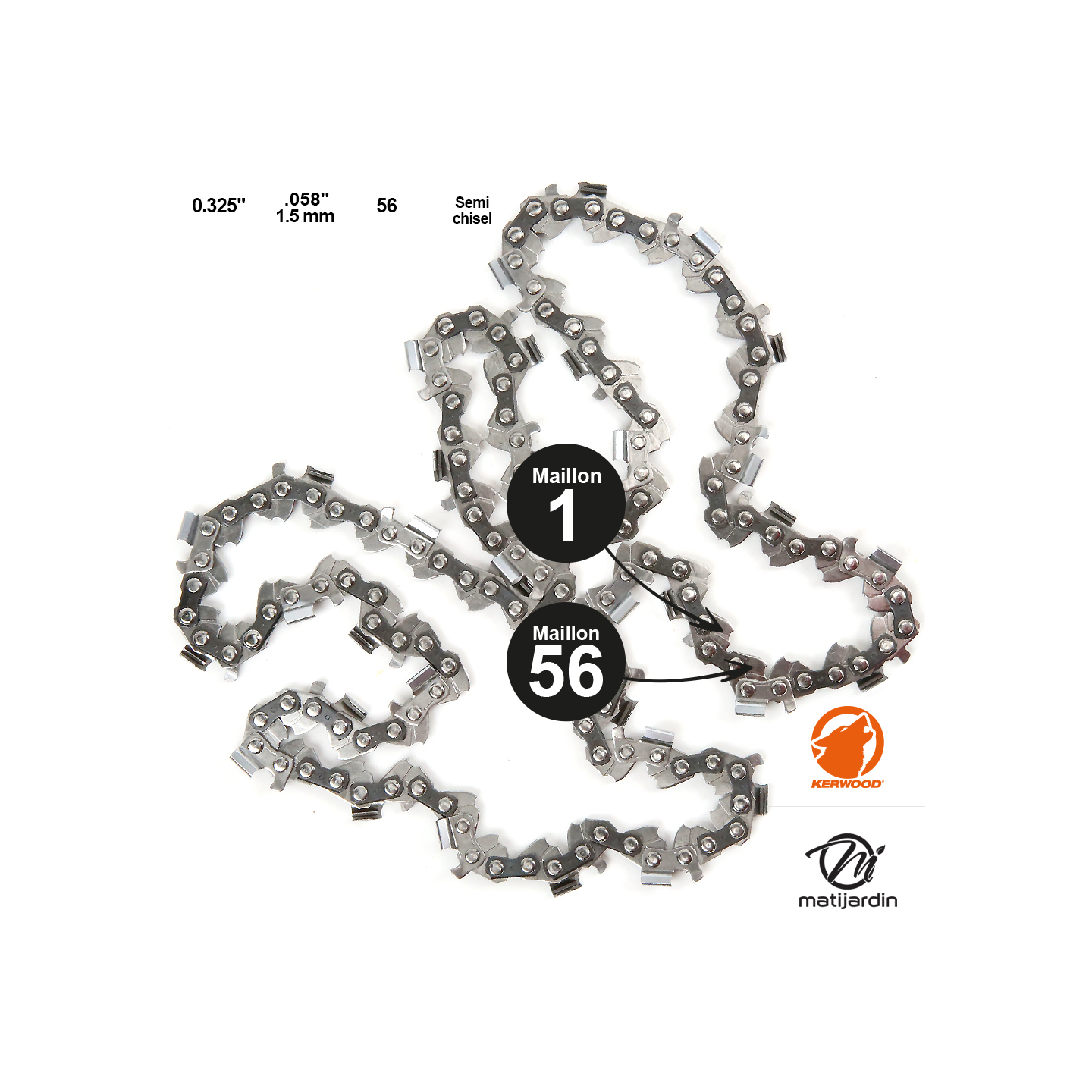 Chaîne Kerwood pour tronçonneuse .325" 1,5 mm. 56 maillons. Gouge profil demi carré